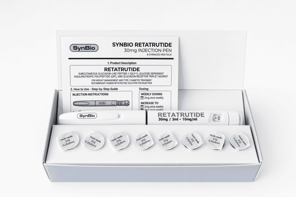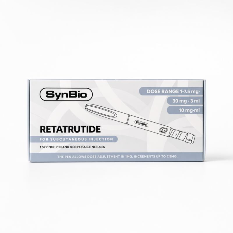 Retatrutide 30mg pre-filled injection pen, manufactured under strict EU quality standards. A triple receptor agonist targeting GLP-1, GIP, and glucagon pathways — one of the most studied next-generation compounds in metabolic research.